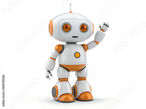 Obraz premium A friendly white and orange robot waving its hand on a white background in a studio shot