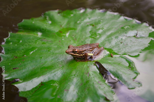 © mitagalihs, Obraz premium A frog sits on a partially submerged lily pad in a garden.