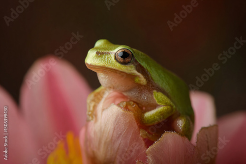© mizmizstk, Obraz premium a frog sitting on top of a pink flower