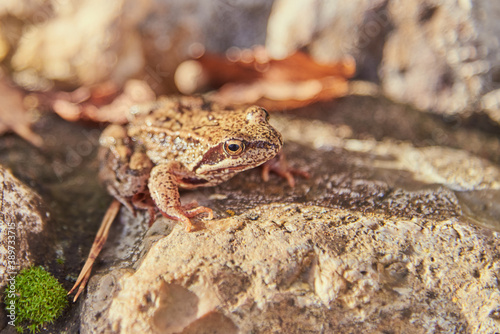 Fototapeta premium A frog, Slightly blurred in the sunlight, sits on light-colored rocks.