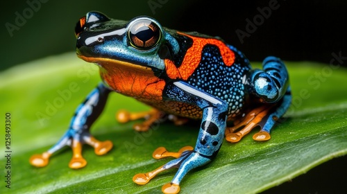 © Parita, Obraz premium A frog with orange and blue spots is sitting on a leaf