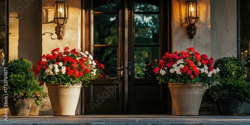 Fototapeta premium A front porch with large potted plants, red and white flowers, and a wooden door with black trim.