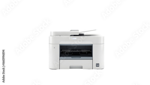Obraz premium A front view of a white multifunction printer on a black background in a...