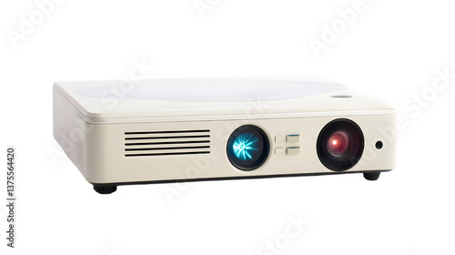 Fototapeta premium A front view of a white projector with visible lens and vents on a dark background in a studio shot