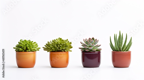 © ckybe, Obraz premium A front view of isolated potted succulents or cacti on a white background.