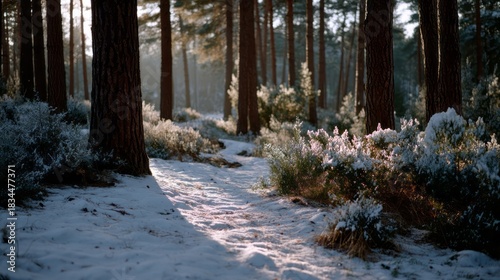 Fototapeta premium A frosted forest path glimmers under ethereal dawn light, whispering tales of...