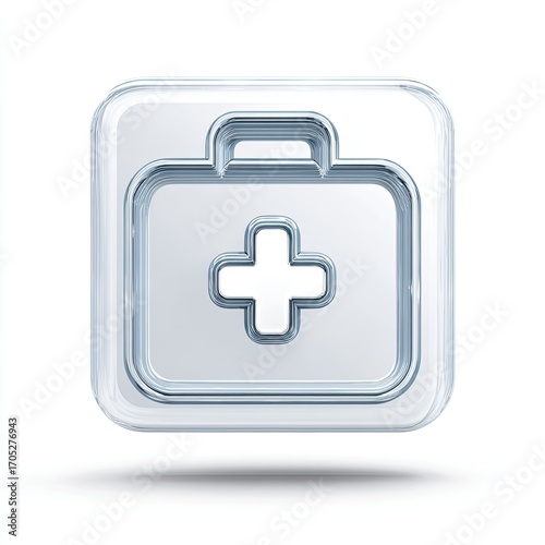 © a muh sakaria, Fototapeta premium A frosted-glass square icon depicting a first-aid kit, featuring a central, cutout cross