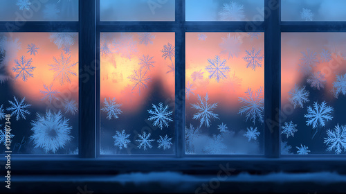 © Thiago, Fototapeta premium A frosted window with intricate snowflake patterns, illuminated by the soft glow of a winter sunrise. Frosted Glow. Illustration