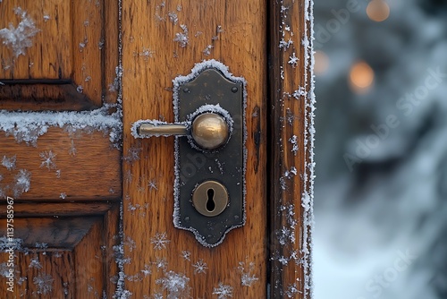 Fototapeta premium A frosty wooden door with a handle and keyhole covered in snow.
