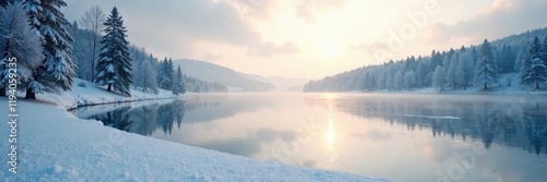 Fototapeta premium A frozen lake's icy surface reflects the pale morning light, frozen lake, winter wonderland, frosty scenery
