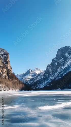 © Khinthong, Obraz premium A frozen lake surrounded by snow-covered mountains under a clear blue sky