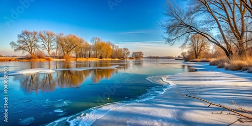 Fototapeta premium A frozen riverbank with bare trees reflecting in the still water, the sun...