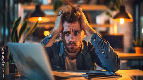 © Vitalii Shkurko, Obraz premium A frustrated man sits at his work desk, hands in hair, surrounded by papers and a laptop, dealing with stress in a dimly lit office.