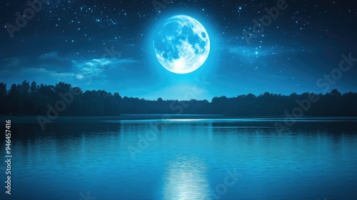 © Napasnan, Fototapeta premium A full blue moon glowing softly above a peaceful lake, with stars reflecting in the water.