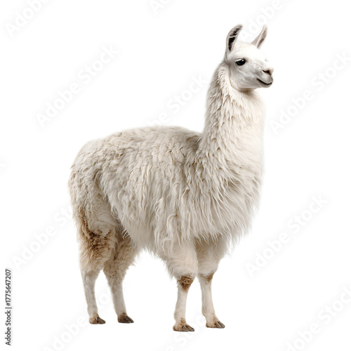 © jamal, Naklejka premium A full body portrait of a white llama standing against a plain black background in a studio shot