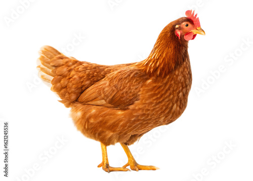 Fototapeta premium A full body shot of a brown hen standing on a white surface with a black...