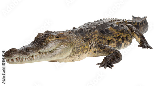 Naklejka premium A full body shot of a crocodile with its mouth closed and visible teeth on a...