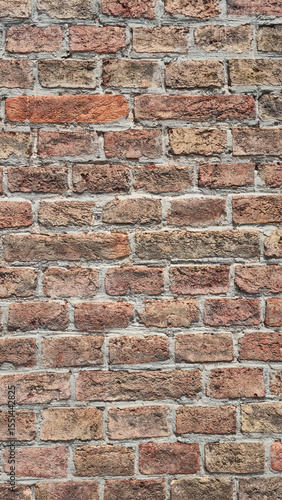 © nahhan, Fototapeta premium A full-frame, textured close-up reveals an old, rustic brick wall with weathered, varied-colored bricks and visible mortar lines, forming a classic pattern