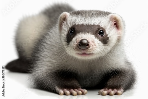 © AkuAku, Fototapeta premium A full grown grey ferret lies alone on a white background. Generative AI