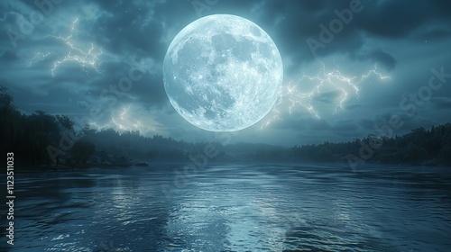 Fototapeta premium A full moon glows over a still lake, surrounded by trees and mist.