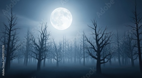 © wahana, Fototapeta premium A full moon illuminates a spooky, foggy forest filled with bare trees in a muted, blue tone