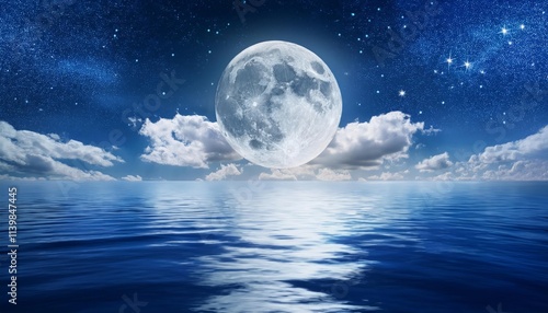 Fototapeta premium A full moon illuminates the ocean at night, reflecting on the water's surface with clouds and stars in the sky