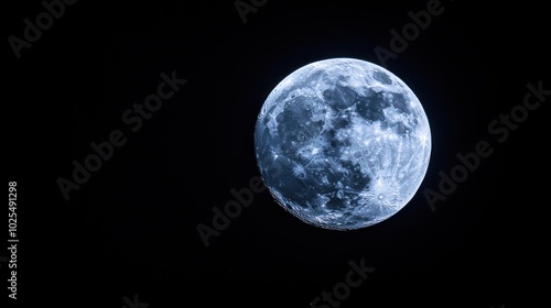 Fototapeta premium A full moon in the night sky, illuminated in a cool blue hue. The moon's...