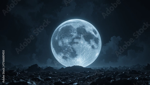 © Roman, Fototapeta premium A full moon shines brightly over a rocky terrain during a clear night. The lunar glow highlights the rough details of the landscape, creating a serene and mystical atmosphere