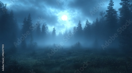 © Ashalina, Fototapeta premium A full moon shines through misty clouds over a dark forest.