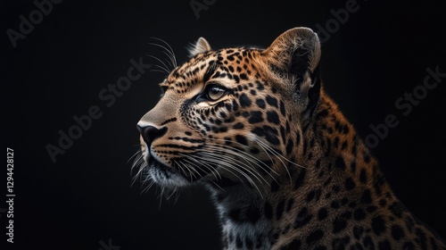 © Boonnam Burart, Fototapeta premium A full profile of a leopard with sharp details against the darkness of the black background