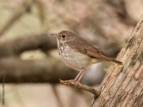 Fototapeta premium A full profile view of a Hermit Thrush sitting out on the tip of a small...