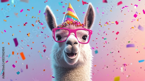 Obraz premium A fun and vibrant scene featuring a llama with pink glasses and a colorful party hat, surrounded by confetti. .