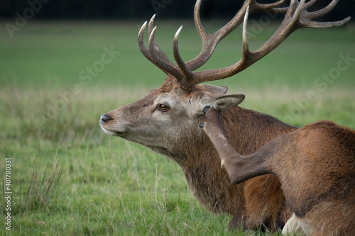© alan1951, Fototapeta premium A fun shot of a red deer stag lying down and scratching his ear with his hoof