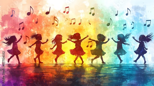 Naklejka premium A fun vector of kids dancing in a circle with musical notes and vibrant colors in the background