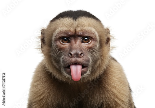 Obraz premium A funny brown capuchin monkey sticks its tongue out, making a silly face against a white background.