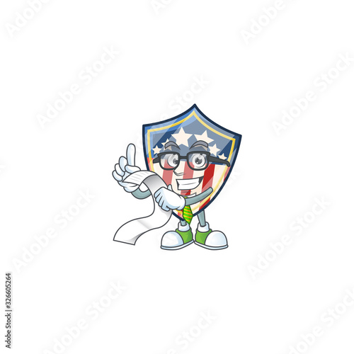 Fototapeta premium A funny face character of vintage shield badges USA holding a menu