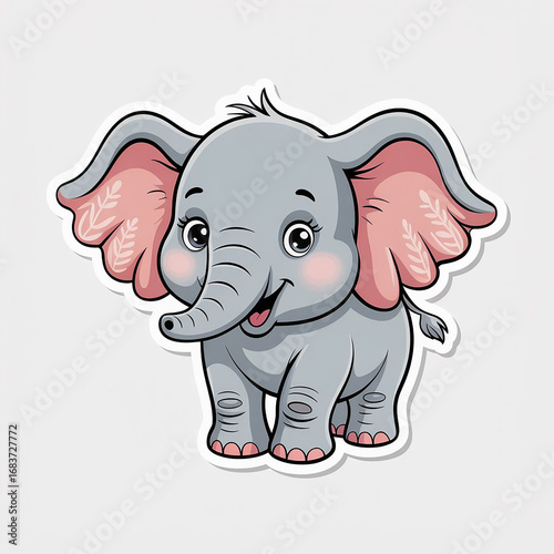 Fototapeta premium A funny, gray baby elephant with a pink trunk is a cute cartoon character illustration for a wild jungle safari adventure