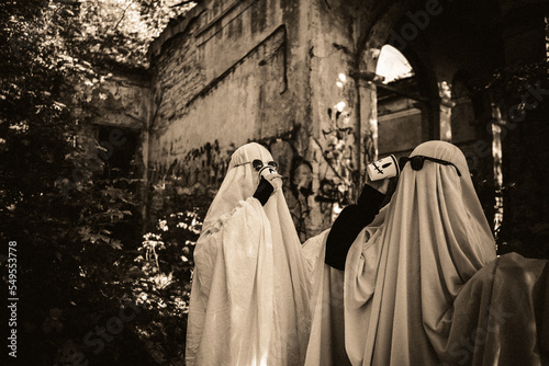 © Tomas Bazant, Naklejka premium A funny image of two people in ghost costumes and sunglasses holding a cup with a drink in an abandoned building, black and white image