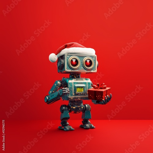 © Miss V, Fototapeta premium a funny little retro robot is holding a Christmas gift wrapped in red paper, he is standing against red background. Season greetings concept