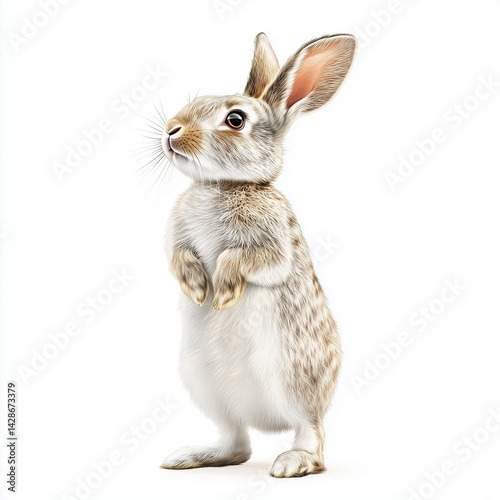 © Sajid, Obraz premium A funny rabbit standing on its hind legs, with oversized ears and a playful expression, isolated against a clean white background.