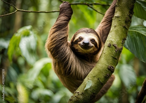 Naklejka premium A funny sloth hangs from a tree branch, sporting a cute expression as it...