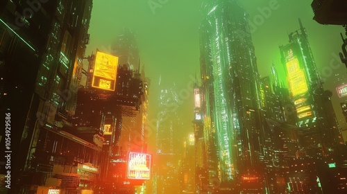 Naklejka premium A futuristic AI-generated cityscape, with holographic billboards and organic-looking skyscrapers glowing under a neon-lit sky.