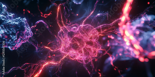 © AI_images, Obraz premium A futuristic AI-powered neural network, composed of glowing cybernetic energy trails, swirling holographic data clusters, and pulsating digital machine learning pathways. The high-tech abstract