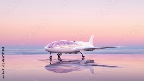Obraz premium A futuristic airplane with a transparent canopy on a reflective floor, soft...