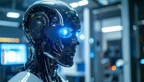 Fototapeta premium A futuristic android robot with glowing blue eyes, highlighting advanced...