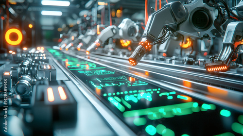 Fototapeta premium A futuristic assembly line featuring robotic arms and illuminated displays,...