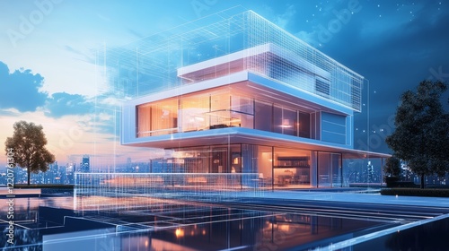 © Intach, Obraz premium A futuristic building project plan showcasing a modern house blueprint and an advanced 3D model, enhanced by generative AI.