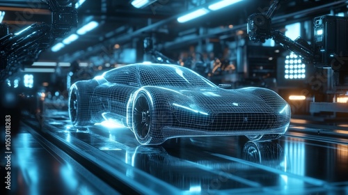 Fototapeta premium A futuristic car is being assembled in a factory with advanced robotics and glowing blue lights.