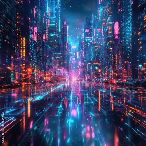 Obraz premium A futuristic city alleyway glows with vibrant electric light reflections