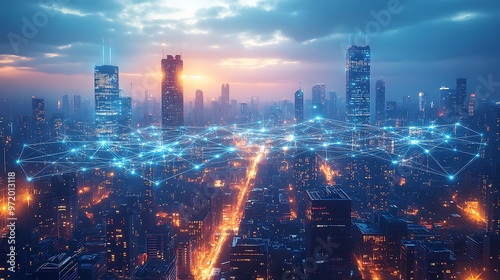 © TranNgoc, Fototapeta premium A futuristic city glowing with digital energy, where interconnected communication lines crisscross between towering skyscrapers, public spaces, and transportation routes.